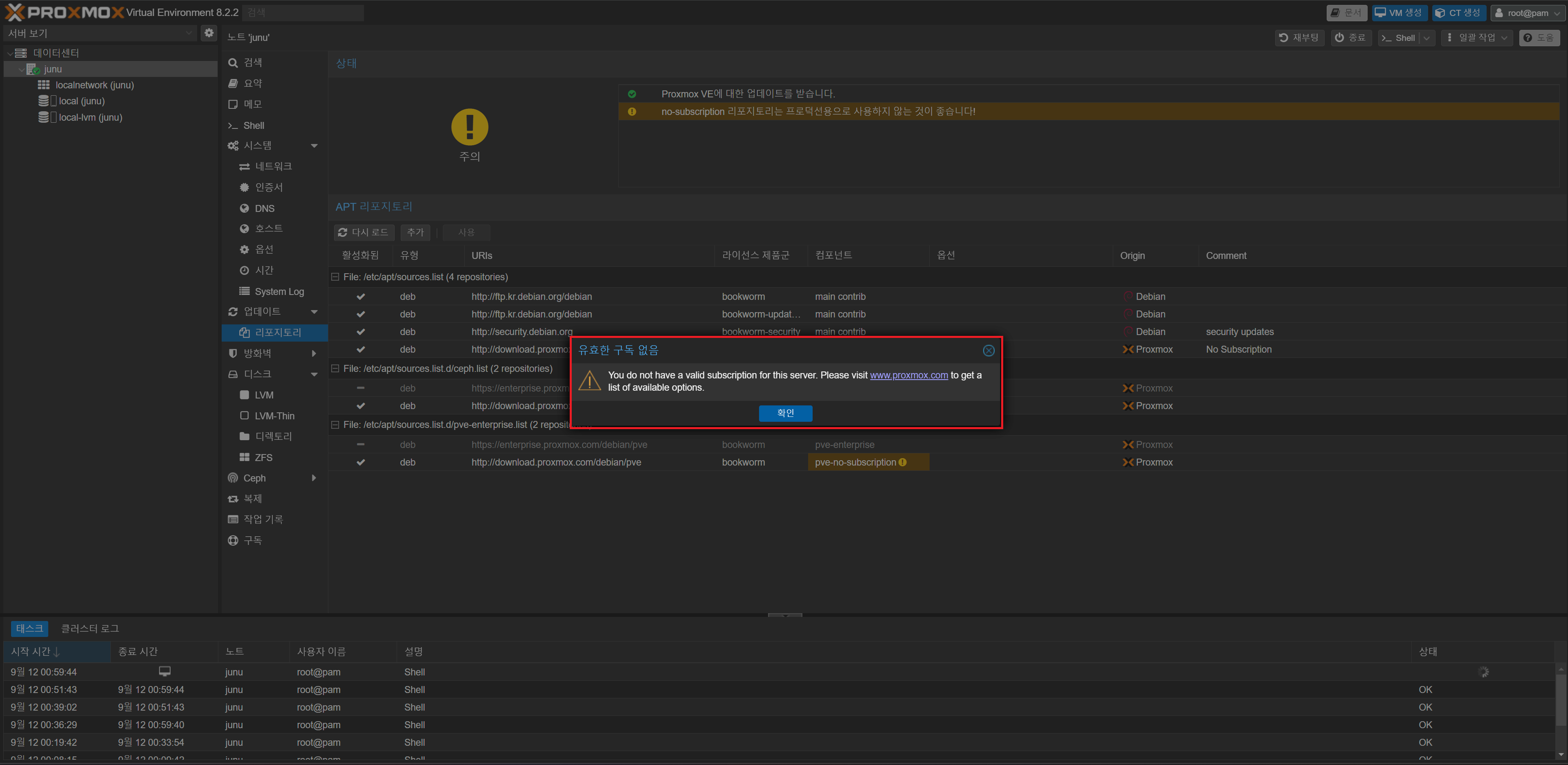 - Proxmox WebUI 통해서 확인하시면 Enterprise 라이선스의 리포지터리가 포함되어 있는 것을 보실 수 있습니다.